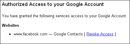 - Never grant access from other sites to your Google account. For example, Facebook can ask you access to your Google account to invite friends. It won't ask you the username and password. Instead, you will be redirected to the Google sign in page where you can grant access to Facebook. This is safer than giving the username and password to Facebook (see previous topic) but even thou, any security breach on Facebook can be exploited to access your Google account.
